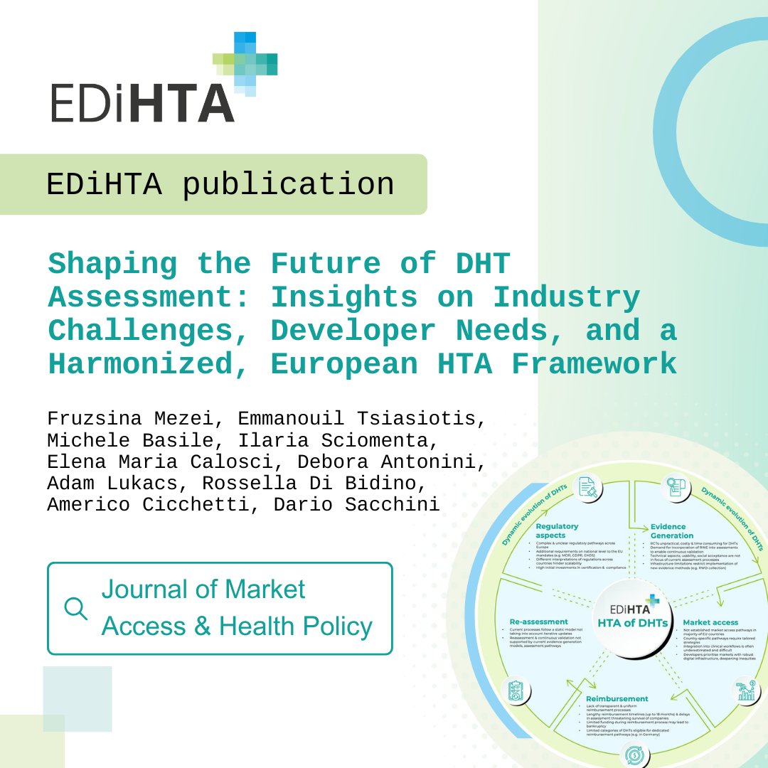 The EDiHTA consortium is proud to announce the publication of its first scientific paper, marking an important milestone in the project’s research and dissemination efforts. The article, titled “Shaping the Future of DHT Assessment: Insights on Industry Challenges, Developer Needs, and a Harmonized, European HTA Framework”, was published in the Journal of Market Access & Health Policy.